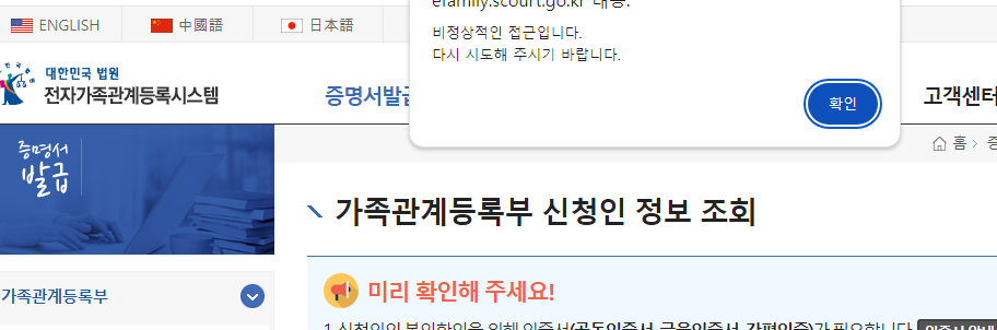 사이트에 들어갔을때 이와같이 '비정상적인 접근...'이라는 경고가 뜨고 더이상 진행이 되지 않아 알아보았다.