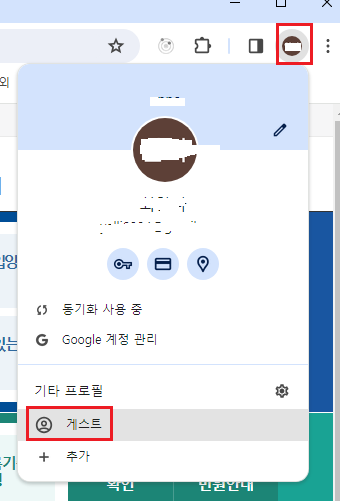 크롬브라우저에서 오른쪽 상단에 계정 아이콘을 누르고 '게스트'항목을 선택한다.