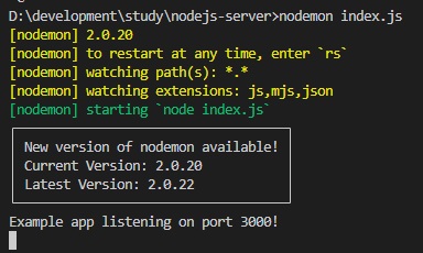 터미널에서 nodemon index.js 명령어를 입력하면 위와 같이 실행이 되고, 이제 번거롭게 서버를 올렸다 내렸다하는 작업을 하지 않아도 됩니다. 또한, -g로 설치 했기 때문에 다른 프로젝트를 새롭게 시작해도 다시 설치하지 않아도 됩니다.