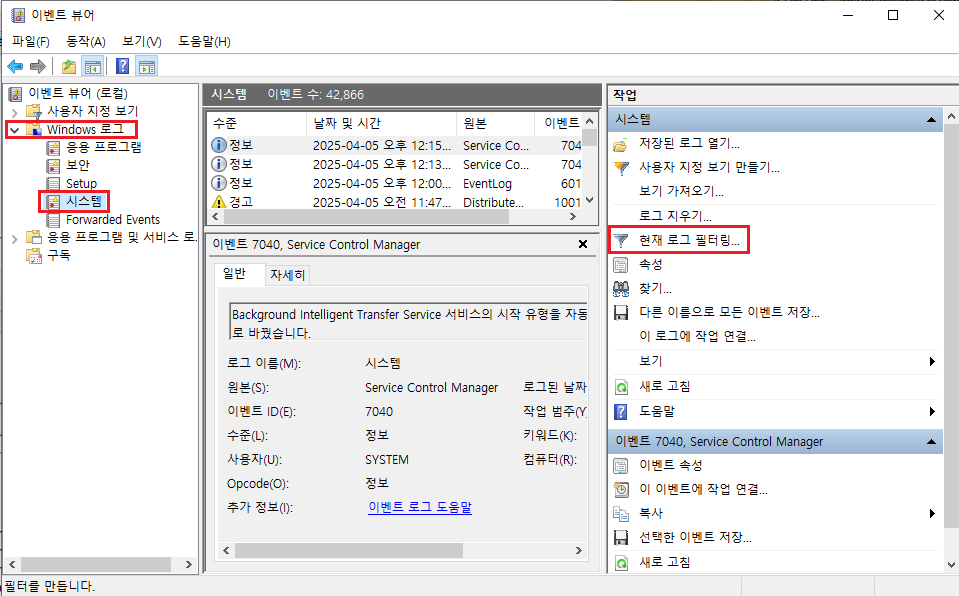 이벤트 뷰어 >> Windows 로그 > 시스템 > 현재 로그 필터링
