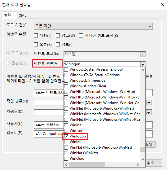 현재 로그 필터링 >> 이벤트 원본 > Winlogon 체크