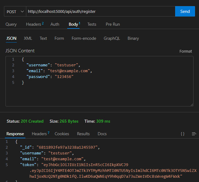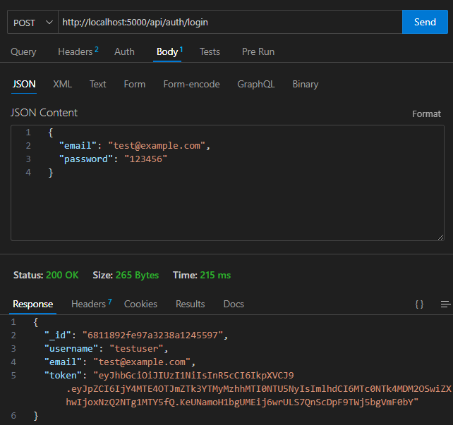 그다음 res.status로 유저 정보를 응답으로 보내고 JWT 토큰도 함께 반환한다.