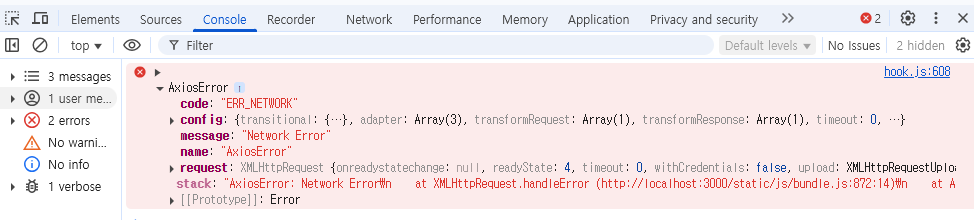 브라우저 Console을 확인해보니 AxiosError라고 뜬다.