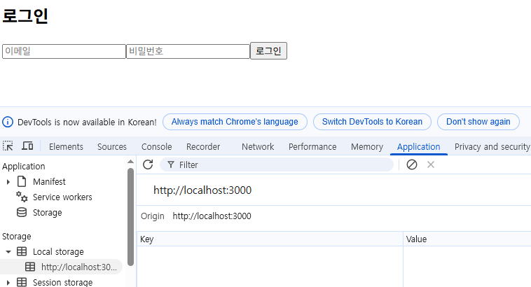 로그아웃 버튼을 누르니 로그인 화면으로 넘어가고 key와 value에 token과 user정보가 삭제된 것을 알 수 있다.